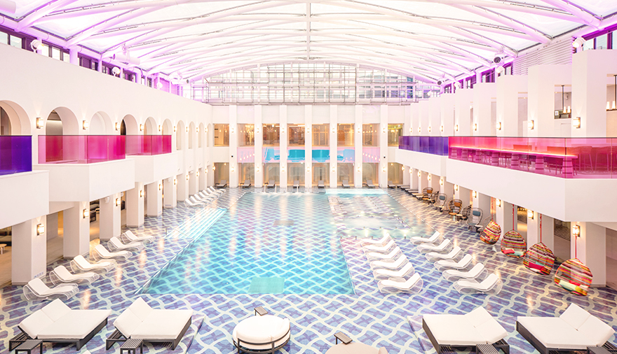 인도어 인피니티 풀의 대표 인증샷은 1층에서 찍어주는 친구가 대기하고, 사람이 없는 틈을 타 멋진 수영 실력을 발휘해 찍는 인어공주 컷이에요. 모델과 촬영자의 합이 가장 중요하답니다!