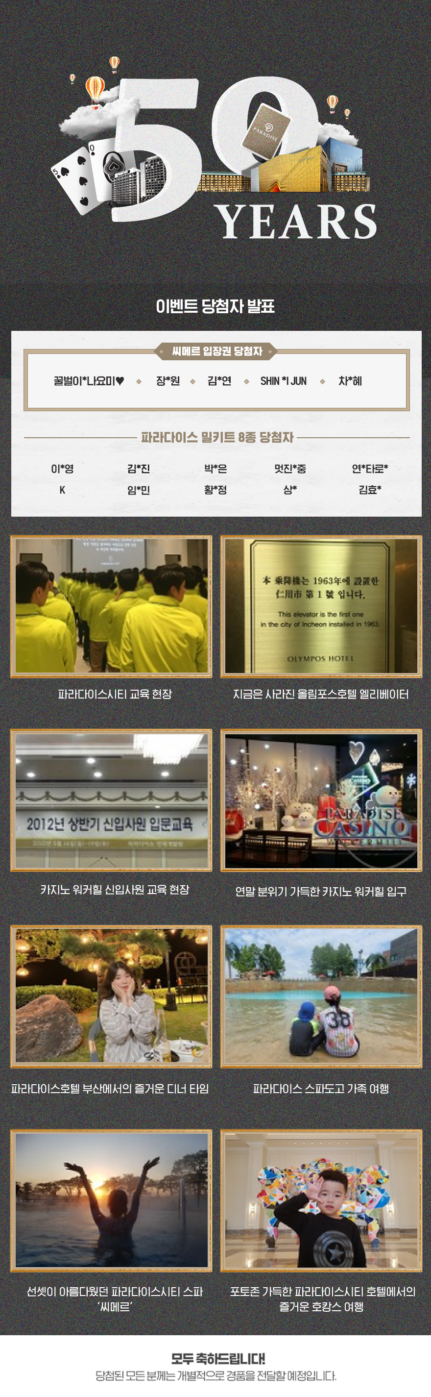 그룹 창립 50주년을 맞아 파라다이스와 함께 한 추억을 공유 받는 이벤트를 진행해 보았는데요. 10년 전 풋풋했던 신입사원 시절의 교육 현장 모습부터 호텔, 스파 등 각종 시설에서 사랑하는 이와 함께했던 특별한 시간까지 다양하고 소중한 추억들을 보내주셨습니다. 50년동안 많은 분들의 기억 속 한 페이지를 장식한 그 순간들을 함께 만나볼까요? 😉