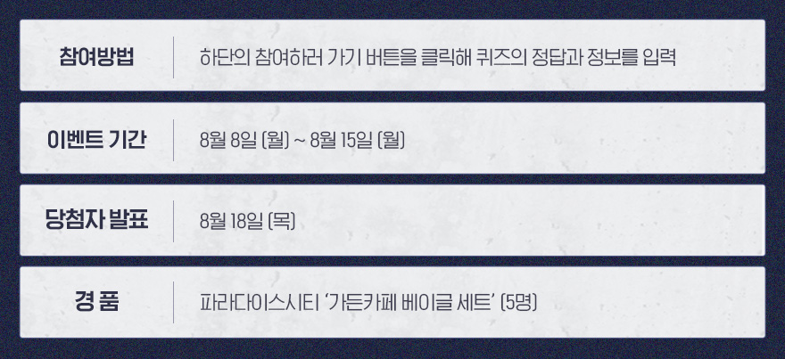 이번 퀴즈 이벤트는 ‘파라다이스 사내보’ 카카오채널을 통해 이어질 예정이니 많은 관심 부탁드립니다.