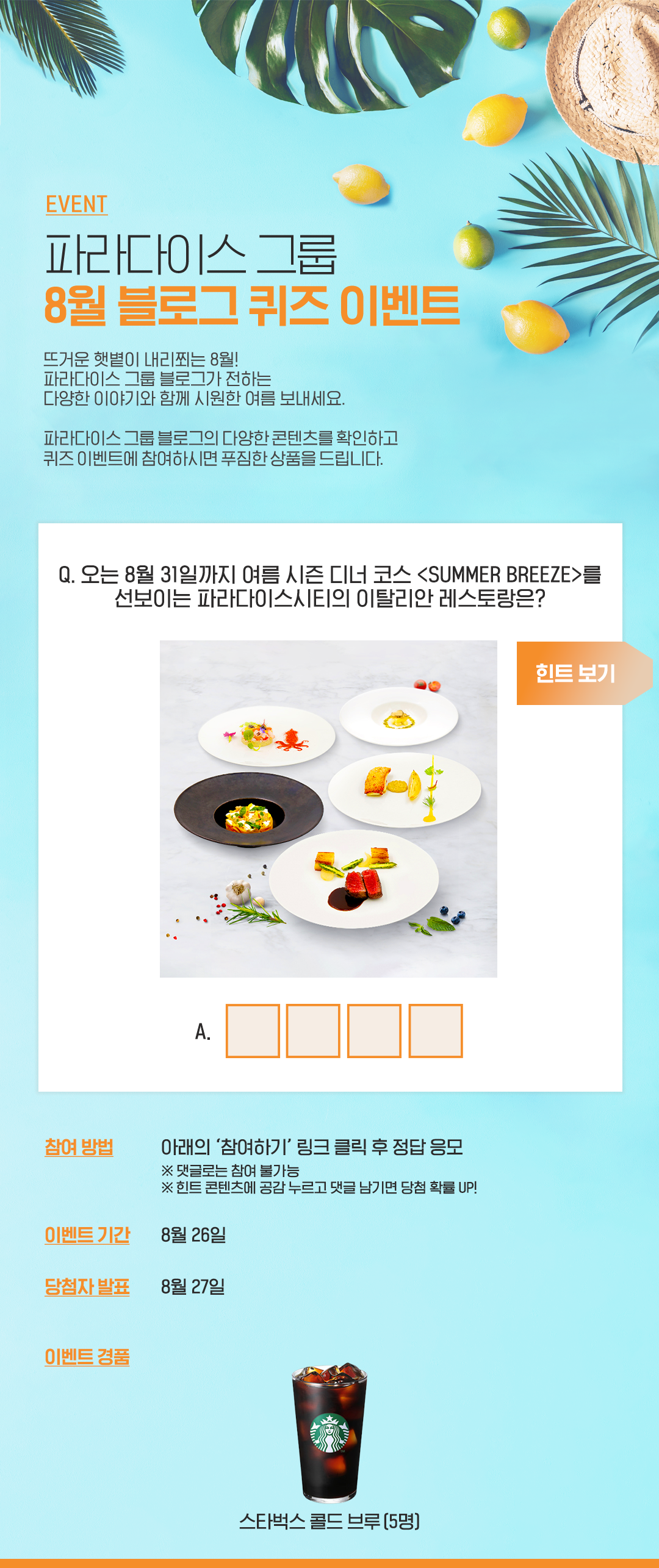 | 파라다이스 그룹 8월 블로그 이벤트 (2회차) & 1회차 당첨자 발표 (9) | 2022.08.23 |
