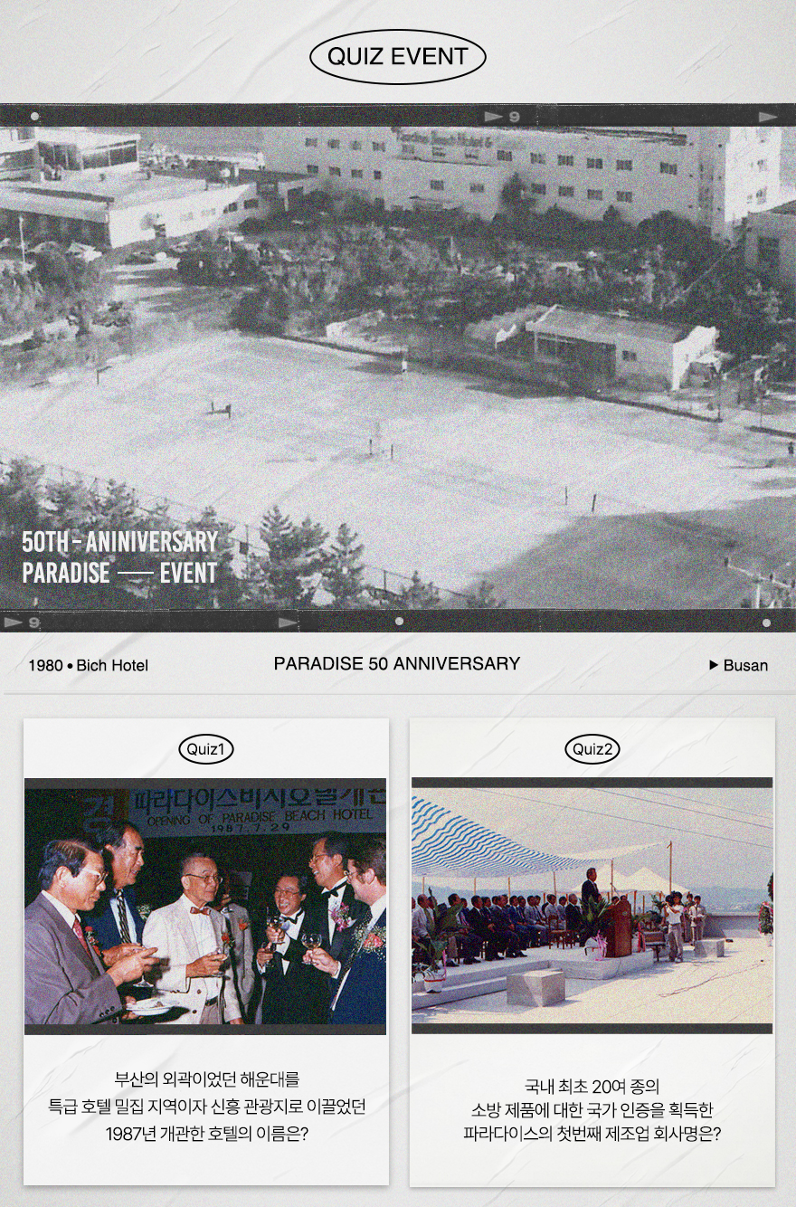 지난 퀴즈 이벤트에서는 70년대 파라다이스 그룹에 관한 이야기를 들여다봤는데요. 이번에는 경제적 부흥과 함께 격변했던 80년대의 모습을 만나보려 합니다. 부산의 ‘호텔 해운대’를 인수하며 파라다이스 호텔 브랜드를 체인화 하기 시작한 일부터 다양한 산업분야로 진출하며 종합그룹으로 도약한 에피소드까지, 파라다이스 그룹에 대해 알아보는 두번째 퀴즈를 확인하시고 이벤트에도 참여해보세요. 추첨을 통해 소정의 상품을 드립니다.