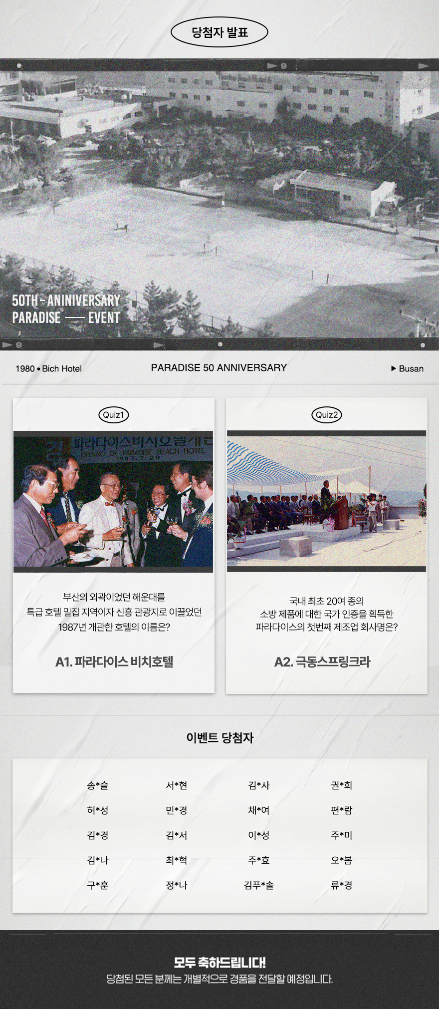 1980년대 파라다이스 그룹은 ‘호텔 해운대’ 인수부터 파라다이스 호텔 브랜드의 체인화, 제조업, 금융업, 건설업 등 다양한 산업분야로 진출하며 종합그룹으로 도약하였는데요. 경제적 부흥과 함께 격변했던 그 시절의 이야기를 담은 퀴즈. 과연 정답은 무엇이었을까요? 정답 확인과 함께 당첨된 행운의 주인공도 확인해보세요 😉