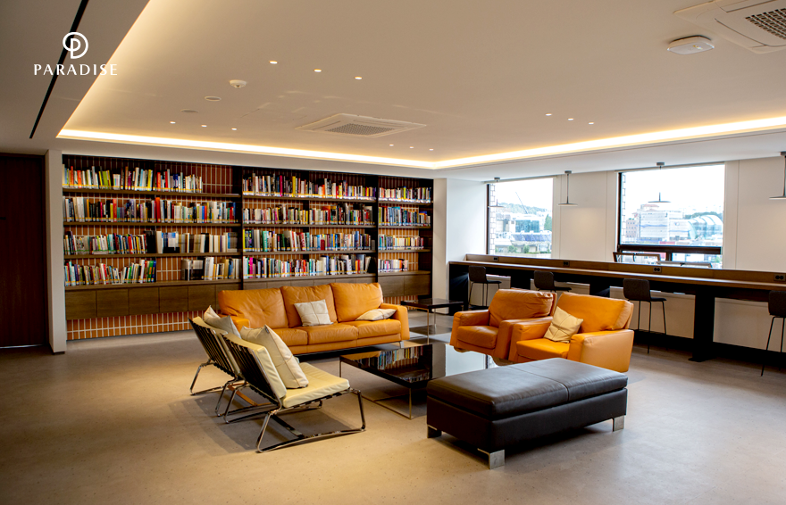 건물 8층에는 방대한 양의 도서를 구비한 라이브러리가 조성되었는데요. 멀리 보이는 풍경을 바라보며 책을 읽을 수 있어 임직원들에게 쾌적하고 편안한 휴게 시간을 제공합니다. 로비 1층에는 음료 머신과 미팅룸이 마련되어 있어 외부인과의 만남도 용이하게 되어있죠. 36년의 찬란했던 장충동의 역사를 뒤로하고 2022년 파라다이스는 진정성 있는 변화와 체질개선으로 퇴계로에서 새로운 시대의 서막을 열어갈 것입니다.