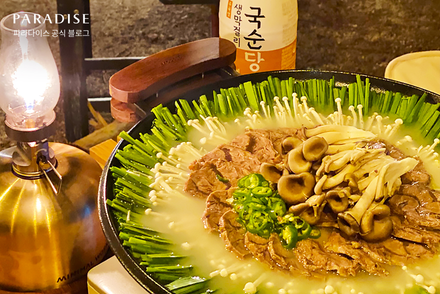 이제 쌀쌀해지는 날씨에 딱인 국물 요리를 소개해드릴게요. 인스타그래머블한 비주얼에 조리법도 간단해서 많은 분들이 만족하셨던 아롱사태전골이에요. 핏물을 뺀 아롱사태를 양파, 대파, 마늘, 된장 한 숟갈, 잠길 정도의 물에 넣고 1시간 삶아주세요. 그리고 아롱사태를 반 잘라서 30분 정도 더 삶아준 다음, 꺼내서 한 김 식힌 뒤 적당히 얇은 두께로 잘라주세요. 그리들에 부추, 팽이버섯, 아롱사태, 느타리버섯 순으로 놓고, 시판용 사골육수를 부어 끓여주면 훌륭한 전골이 완성된답니다. 겨자소스, 막걸리와 함께 곁들이면 쌀쌀한 가을 캠핑의 저녁이 완벽해질 거예요. 저녁엔 아롱사태 수육을 만들어 먹고, 다음 날 아침엔 만들어둔 아롱사태 수육을 얹은 쌀국수를 드셔보는 것도 추천해요.