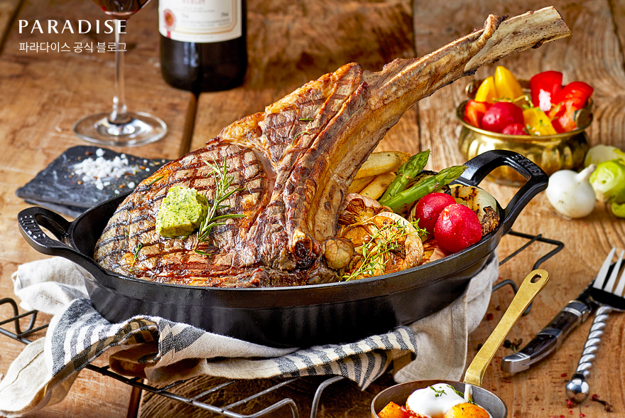 먼저 파라다이스 호텔 부산의 시그니처 메뉴이자 남다른 고기 두께를 자랑하는 토마호크 스테이크입니다! 손잡이처럼 기다란 갈비뼈가 붙어있는 형태로 미국산 최고 등급인 프라임급만을 엄선해 풍부한 육즙을 느낄 수 있는데요. 최고급 와인 페어링과 함께 이탈리아 본연의 맛을 경험해보시기 바랍니다.
