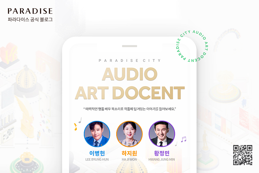 파라다이스시티에서 울리는 격조 높은 목소리! 파라다이스시티가 한류를 대표하는 이병헌, 황정민, 하지원 세 배우의 목소리와 함께 예술작품을 만나볼 수 있는 ‘오디오 아트 도슨트’를 선보입니다. 명품 배우들의 부드러운 목소리와 함께 파라다이스시티의 미술품을 감상할 수 있는 기회! 오디오 아트 도슨트에 대해 지금부터 함께 알아볼까요?