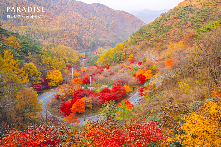 첫 번째로 추천하는 곳은 단양의 보발재에요. 뱀처럼 구불구불한 도로 사이에 단풍이 흐드러지게 피어난 가을 드라이브 명소인데요. 단풍길을 따라 드라이브를 즐겼다면 정상에 위치한 전망대에서 바라보는 보발재의 경치도 놓치지 마세요!