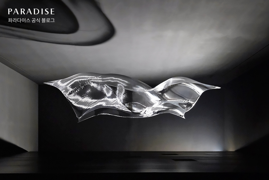 이번 신작 <Floating World - Dawn Particles> 또한 첨단기술로 자연의 현상을 표현한 작품인데요. 전시공간 속에서 빛이 번개처럼 나타났다가, 안개 속으로 사라졌다가, 다시 은은하게 보이기도 하면서 형체 없이 흐르는 공간을 온 몸으로 느낄 수 있었습니다. 실제로 관객이 서 있는 곳은 파라다이스 아트 스페이스지만, 구름 속 어딘가 상상 속의 비현실적인 공간에 온 듯한 느낌을 받을 수 있는 작품이랍니다.