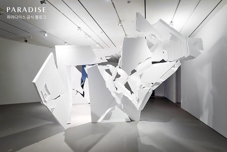 사실 이 작품에는 재미난 뒷이야기가 숨겨져 있는데요. 작가가 파라다이스시티 구석구석을 탐험하다가 거대한 파라다이스시티 속 숨겨진 작은 사무실 공간을 발견하였고, 실제로 찾은 공간을 본 떠 전시장으로 옮긴 후 해체한 작품입니다. 비밀스럽게 숨어있던 공간이 폭발하며 이제는 안쪽까지 다 들여다 볼 수 있게 된 것이죠.