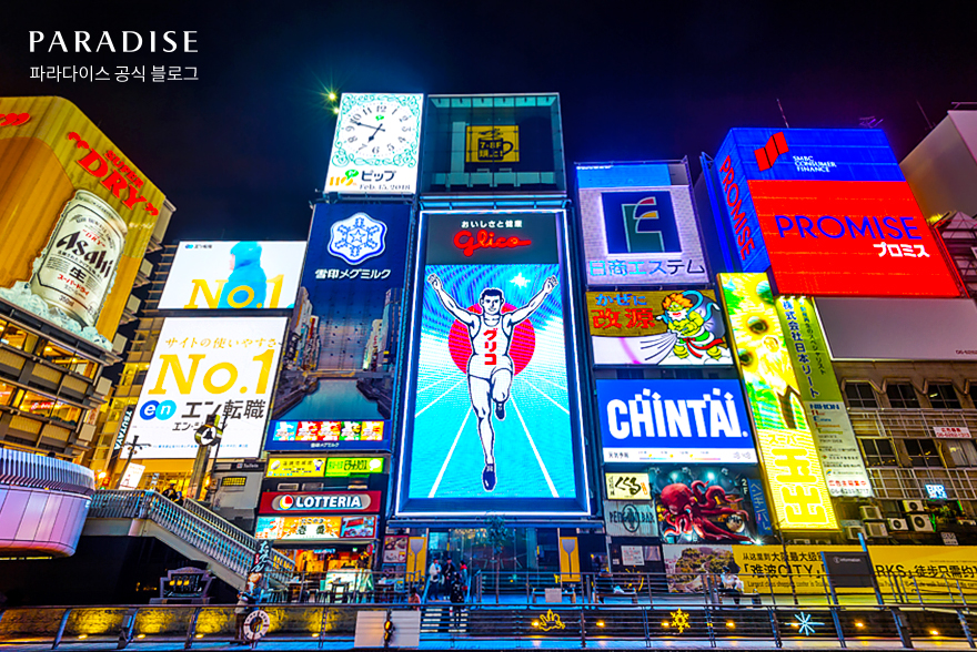 오사카 여행 코스 추천 그 첫 번째는 바로 오사카를 대표하는 상업 지구인 도톤보리입니다. 오사카 도톤보리는 관광객들의 필수 기념 촬영 장소인 글리코상 간판을 비롯해 반짝이는 네온사인과 화려한 간판들로 밤에도 많은 사람들로 북적이는데요. 도톤보리하면 누구나 가장 먼저 떠올리는 글리코상 간판 앞에서 간판의 남자와 같은 포즈로 인증 사진을 남기는 것을 추천합니다.