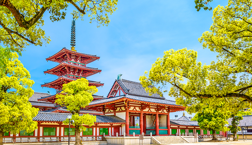 지금까지 오사카의 현대적인 모습을 살펴봤다면 이제는 오사카의 오랜 전통과 역사 탐방을 떠날 차례! 네 번째로 추천할 오사카 여행 코스는 일본에서 가장 오래된 사찰인 시텐노지입니다. 시텐노지는 일본에 불교를 들여왔다고 알려진 쇼토쿠 태자가 593년에 세운 절로, 오사카의 명소를 이야기할 때 빠지지 않는 곳인데요. 남쪽에서 북쪽을 향해 중문, 오층탑, 금당, 강당을 일직선으로 배치하는 ‘시텐노지식 가람 배치’라는 일본에서 가장 오래된 건축 양식으로 지어진 것으로 유명합니다.