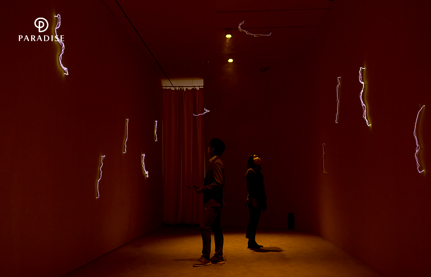 이어지는 2층에서는 ‘흐르는 공간’을 만날 수 있습니다. A.A무라카미 작가의 ‘Flooting World’는 마치 흐린 날 구름 속으로 들어가는 듯한 느낌을 주는데요. 안개 속에서 번쩍하고 빛났다가 사라지는 번개의 형상을 가까이서 경험할 수 있죠. 마지막은 오마키 신지의 ‘The Shadow of Time’입니다. 공중에서 압도적인 크기의 검은 천이 떠다니는 이 작품은 마치 중력과 시간을 거스르는 듯한 기분을 느끼게 해주는데요. 가만히 작품을 보고 있으면 우리가 발을 딛고 있는 현실에서 벗어나 새로운 공간을 경험하는 듯한 느낌을 줍니다.