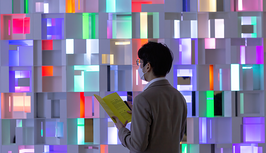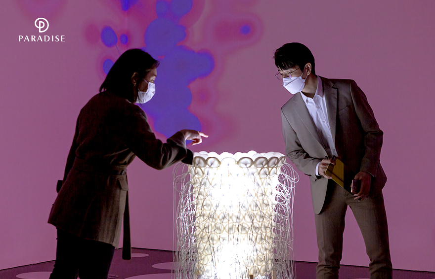 전시는 흩어진 공간에서 시작합니다. 처음 마주하는 작품은 서민정 작가의 ‘Sum in a point of Time’입니다. 공간이 폭발하는 찰나의 순간을 슬로우 모션으로 보는 듯한 생동감을 느낄 수 있는 작품인데요. 서민정 작가가 파라다이스시티를 살펴보던 중 우연히 발견한 작은 사무실 공간을 그대로 본뜬 후 해체하여 만들었다고 합니다. 이어지는 작품은 양민하 작가의 ‘공생’입니다. 전시장 한 가운데에 자리잡은 원통형의 조형물은 알고리즘에 의해 시시각각 다양한 빛을 내뿜습니다. 220개의 인공 생명체가 함께 살고 있는 공간을 표현했다고 하는데요. 두 체험자도 가까이 다가가 신비로운 분위기의 작품을 다각도로 감상했습니다.