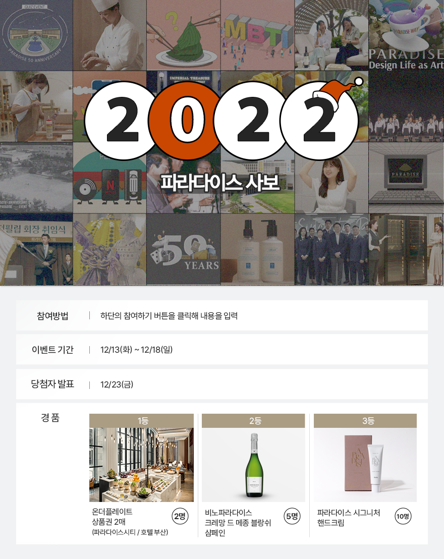 어느새 2022년의 끝자락입니다. 올 한해 파라다이스 그룹에 대한 이야기부터 문화·예술, 미식, 라이프 스타일까지 다양한 주제에 대해 임직원과 함께 콘텐츠를 만들고 구독자들과 이야기를 나눠보았는데요. 지난 2022년 여러분에게 가장 큰 공감을 안겨 준 아티클은 무엇인가요? 아래 ‘참여하러 가기’ 버튼을 클릭해 소중한 의견을 남겨주세요. 최애 아티클과 선정 이유를 작성 주시면 추첨을 통해 따뜻한 연말을 위한 풍성한 선물을 보내드립니다.