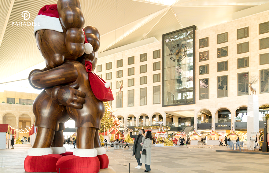 다음으로 두 매니저는 파라다이스 워크를 지나 플라자 광장으로 향했습니다. 광장에는 유럽 크리스마스 감성이 가득한 크리스마스 마켓이 열리고 있는데요. 화려한 크리스탈로 눈길을 사로잡는 바카라 브랜드와 귀여운 산타 모자를 쓴 와인으로 가득한 비노파라다이스, 그리고 성수동의 유명 수제 맥주 브랜드 어메이징 브루잉 맥주와 페어링 하기 좋은 로스트치킨&칩스 등의 F&B 부스까지 다양한 볼거리와 먹거리가 준비되어 있습니다. 크리스마스 부스 외에도 플라자 광장에는 눈길을 사로잡는 작품이 있었는데요. 한쪽 입구에 위치한 거대한 나무 조형물 카우스의 ‘Together’ 입니다. 서로 포옹을 하고 있어 따뜻한 느낌을 주는 이 작품은 산타 모자와 신발을 착용해 귀여움을 더했는데요. 빨간색 아이템으로 플라자의 크리스마스 분위기도 한층 더 높여주었습니다.