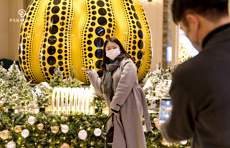 오늘의 체험자는 파라다이스시티 PTIC 파트의 전승재 매니저와 하지인 매니저입니다. 두 파라디안은 같은 팀에서 근무하는 선후배인데요. 한해 동안 열심히 일한 서로를 칭찬하고 격려하기 위해 이번 체험을 신청했다고 합니다. 파라다이스시티에 들어서자 트리를 비롯해 화려하게 펼쳐져 있는 크리스마스 분위기가 두 사람을 맞이했는데요. 그 중에서도 눈에 가장 먼저 띈 것은 블링블링한 크리스마스 분위기로 꾸며진 쿠사마 야요이의 ‘Great Gigantic Pumpkin’입니다. 하 매니저는 작품 앞으로 달려가 포즈를 취하고 두 매니저는 서로의 인증샷을 찍어주었는데요. 연말 파라다이스시티를 방문한다면 최고의 포토 존인 이곳에서 기념 사진 남기는 것을 잊지 마세요.
