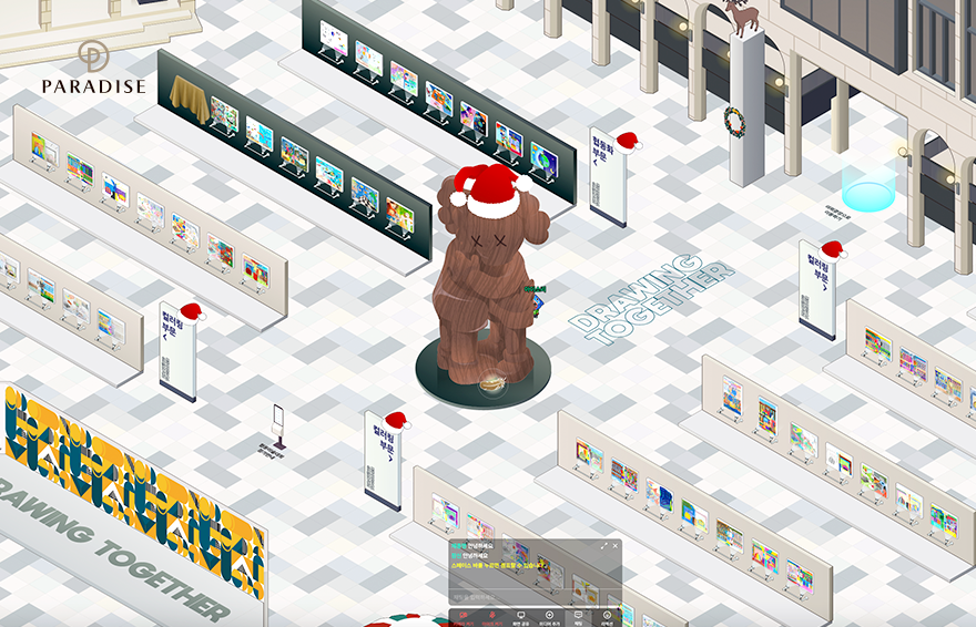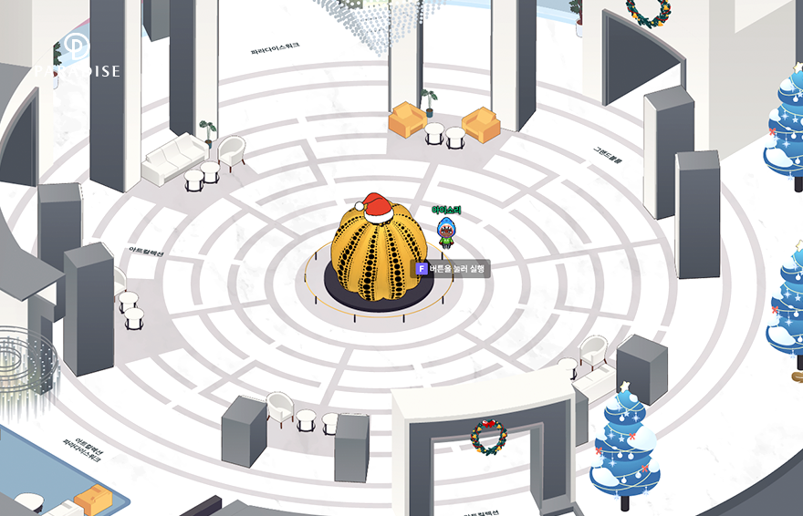참여자들은 파라다이스시티의 유명 예술 작품을 감상하는 온라인 아트 투어도 즐겼습니다. 캐릭터를 이용해 파라다이스시티 곳곳을 둘러보며 작품을 발견하는 재미가 있었는데요. 로비에 위치한 데미안 허스트의 ‘Golden Legend’, 쿠사마 야요이의 ‘Great Gigantic Pumkin’, 파라다이스 워크에 위치한 로버트 인디아나의 ‘Numbers, One Through Zero’ 등 세계적인 작품들을 만나볼 수 있었습니다. 작품 앞에서 ‘F’키를 누르면 해설과 오디오 도슨트도 제공되어 더욱 풍성하게 작품을 감상할 수 있었죠. 이 외에도 깃털 스템프 투어를 비롯한 미로 찾기, 퀴즈 게임, 장애물 달리기 등 다양한 게임과 이벤트로 참가자들에게 푸짐한 선물과 색다른 재미를 선사해주었습니다.
