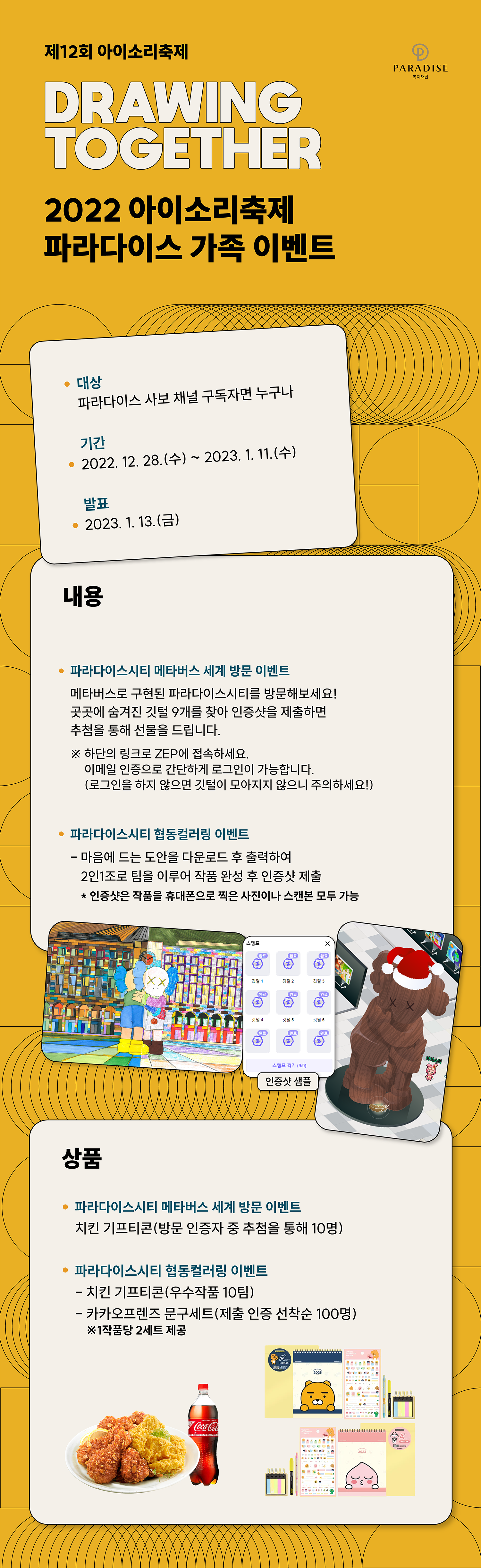 성황리에 종료된 아이소리축제의 마지막을 기념하여 파라다이스 복지재단에서 특별한 이벤트를 준비했습니다. 아이소리축제 온라인 현장을 직접 방문하여 깃털을 모아 인증하는 ‘방문 이벤트’와 도안에 나만의 개성을 담은 색을 완성 한 후 인증샷을 제출하는 ‘협동 컬러링 이벤트’ 입니다. 풍성한 선물도 준비되어 있으니 이 기회를 놓치지 마세요.