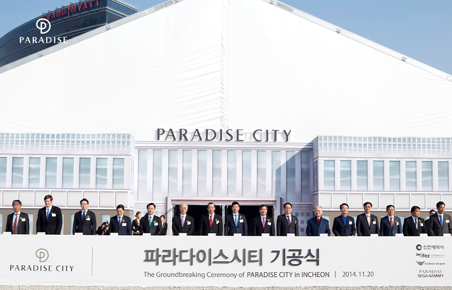 2014년 11월, 한국 관광산업의 랜드마크로 자리잡을 글로벌 복합리조트 파라다이스시티의 기공식이 열렸습니다. 3년동안 입찰부터 기획까지 각자의 위치에서 고군분투한 임직원의 노고가 현실로 이루어진 것인데요. 첫 삽을 뜨는 기념적인 현장에 파라다이스 전필립 회장을 비롯한 세가사미홀딩스의 사토미 회장, 유정복 인천시장 등 400여 명의 주요 인사 및 기자들이 함께했습니다.