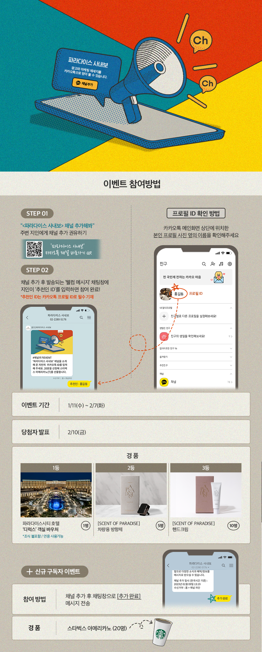 아직 ‘파라다이스 사내보’ 카카오 채널을 구독하고 있지 않다면 채널을 추가하고 주변 지인들에게 채널을 알려주세요. 가장 많은 구독자를 가입시킨 분에게 럭셔리한 파라다이스시티 호텔 숙박권을 선물로 드립니다. 신규 구독자분들에게는 추첨을 통해 스타벅스 아메리카노도 제공하고 있으니 미니 이벤트 혜택도 놓치지 마세요😉