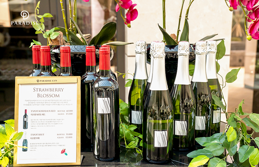 스트로베리 블라썸에 가야 하는 또 하나의 이유가 있습니다. 출시 일주일 만에 완판 되어 온라인과 시중에서는 구하기 어려운 티스팟 와인을 파라다이스시티 딸기 뷔페 현장에서 구매할 수 있기 때문이죠. 이곳에서는 웰컴드링크로 제공되는 브뤼 뿐만 아니라 티스팟의 레드와인도 함께 만나볼 수 있는데요. 와인 하면 세 손가락 안에 꼽을 수 있는 유명 생산지 보르도에서 온 이 와인은 레드 베리류의 붉은 과실향과 오크 숙성에서 온 바닐라 뉘앙스의 밸런스가 돋보입니다. 뷔페 안에서는 티스팟 보르도 레드를 직접 맛보고 구입할 수 있다고 하니 이 기회를 놓치지 마세요.