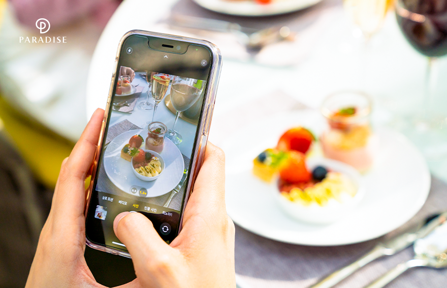 다음으로 봄 분위기 물씬 풍기는 꽃장식이 돋보이는 테이블 전경과 빛을 가득 머금은 화사한 나무를 배경으로 사진을 찍었는데요. 가든바이라쿠에서는 정오부터 오후 2시까지 햇살이 가장 아름답게 비춘다며 인스타그래머를 위한 유용한 팁을 전했습니다. 홍 매니저는 딸기 디저트들을 오브제로 활용하는 팁을 전하기도 했는데요. 화사한 딸기 디저트들을 자신의 접시에 예쁘게 플레이팅 한 후 고급스러운 잔에 담긴 웰컴 드링크나 분홍빛의 딸기 주스를 손에 들고 촬영하면 화사함을 더할 수 있다고 덧붙였습니다. 여러분들도 파라디안의 팁을 참고해서 파라다이스시티 딸기뷔페에서 나만의 인생 사진을 꼭 남겨 보길 바랍니다.