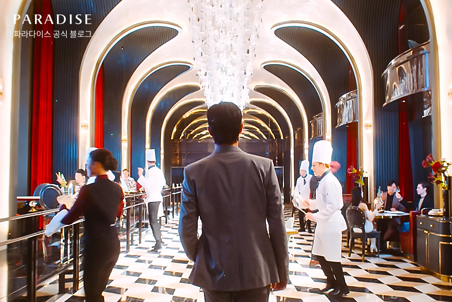 다음으로 박서준 배우를 따라 들어선 공간은 파라다이스시티가 자랑하는 모던 다이닝 한식 레스토랑 ‘새라새’입니다. 창의적이고 트렌디한 한식 메뉴를 제공하는 새라새 안에는 화려한 파티가 한창 진행되고 있는데요. 반짝이는 샹들리에와 길게 이어진 테이블, 박서준 배우가 열어본 그릇에 담긴 군침을 자극하는 스테이크가 눈길을 사로잡습니다.