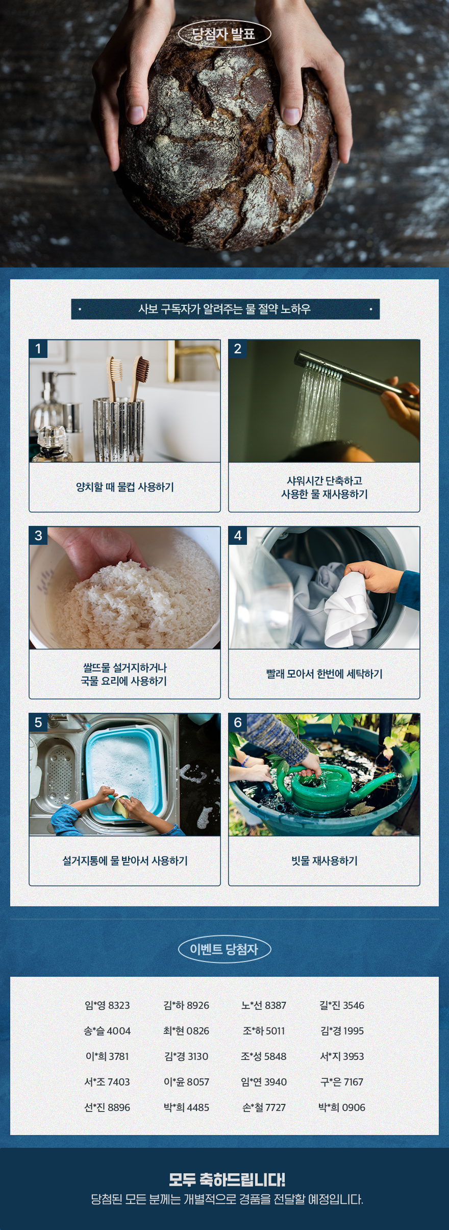 우리는 가끔 물의 소중함을 잊고 삽니다. 3월 22일 UN이 지정한 세계 물의 날을 통하여 물의 소중함을 되새기는 시간을 가져보는 건 어떨까요? 3월 이벤트 기간 동안 많은 분들이 일상에서 지킬 수 있는 다양한 물 절약 방법을 공유해 주셨는데요. 사보 구독자가 알려주는 물 절약 노하우와 함께 행운의 당첨 주인공을 공개합니다.