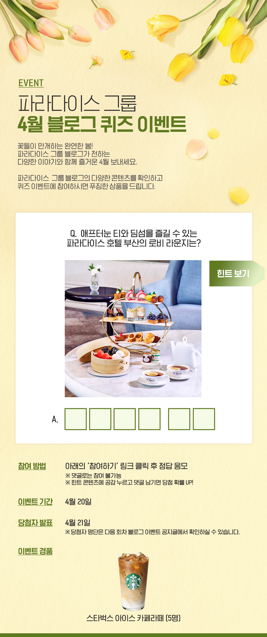 | 파라다이스 그룹 4월 블로그 이벤트 (3회차) & 2회차 당첨자 발표 (32) | 2023.04.19 |