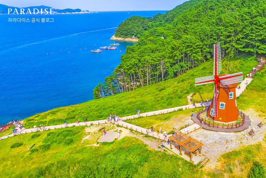 산책로를 쭉 따라가면 만나는 전망대는 바다 너머 노자산을 등지고 자리 잡은 학동마을의 아름다운 전경을 볼 수 있는 특별한 장소입니다. 이때 감성적인 분위기를 더해주는 풍차도 놓치지 마세요. 마치 유럽에서 여행을 하고 있는 듯한 이색적인 사진을 찍을 수 있답니다.