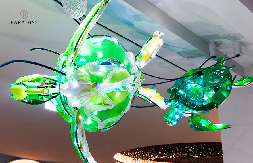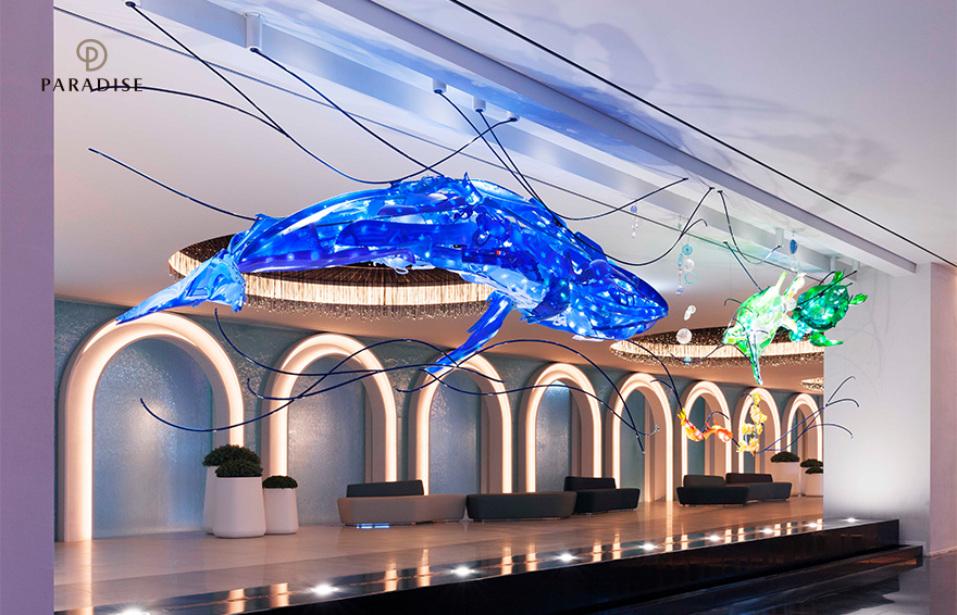 사야카 간즈의 생동감 넘치는 작품들 중에서 파라다이스시티 씨메르에서 만날 수 있는 작품은 2018년 작 <Coexistence>입니다. 공존이라는 의미의 이 작품은 고래와 바다거북, 물고기들이 행복하게 바다를 함께 누비는 풍경을 표현한 것으로, 재생 플라스틱 물체들을 사용해 탄생되었습니다. 다양한 색상의 플라스틱 물체들로 만들어진 이 설치 작품은 내부의 LED 전구를 통해 부드러운 빛을 발하는데요. 관람자들은 마치 그림책 속의 세계로 들어온 듯한 환상적인 기분을 느낄 수 있습니다. 하지만 작품을 조금 더 깊이 들여다 보면 이 플라스틱 조각들이, 작품으로 표현된 실제 동물들에게 엄청난 악영향을 끼치고 있다는 사실을 깨달으면서 관람자로 하여금 환경과 공존에 대한 의미도 되새기게 합니다.