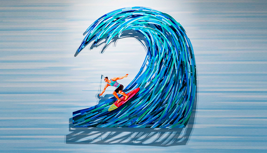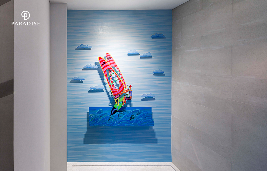 데이비드 걸스타인의 작품은 아트 스파 씨메르와 완벽하게 어우러지는데요. 그의 2018년 작품 <Wind Surfing>, <The Surfer>, <The Bathers>는 바다에서 스포츠를 즐기는 사람들의 모습을 다이내믹하게 표현하고 있습니다. <Wind Surfing>에서 청록색 바다와 돛의 화려한 색상들이 마법같은 상쾌함을 보여주는 동시에 돛을 잡은 서퍼는 강력한 긴장감을 선사하죠. <The Surfer>에서는 큰 파도를 타는 서퍼의 모습을 통해 생동감 넘치는 파도의 매력을 한껏 전달합니다. <The Bathers>는 물가에서 즐겁게 뛰노는 두 친구의 모습을 담고 있는데요. 일상 속 걱정에서 벗어난 듯한 활기찬 모습으로 공감을 이끌어 냅니다. 또한 이 작품들에는 특별한 스토리가 숨겨져 있습니다. <Wind Surfing>, <The Surfer>, <The Bathers> 총 세 작품은 실제로 씨메르에서 영감을 받아 제작되었는데요. 그가 씨메르에서 보낸 여유 가득한 순간들이 작품에 유쾌하게 녹아들어 있으니, 씨메르에서 그의 그림과 함께 청량한 에너지를 만끽해보시길 바랍니다.