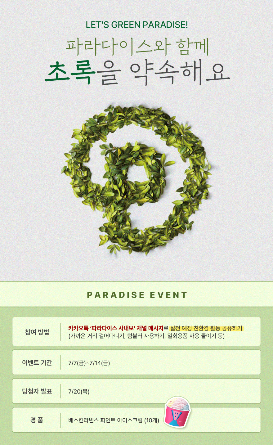 | [사보 이벤트/당첨자발표] 파라다이스와 함께 하는 그린캠페인, 생활 속 나만의 친환경 실천 방법을 공유해주세요! (0) | 2023.07.20 |