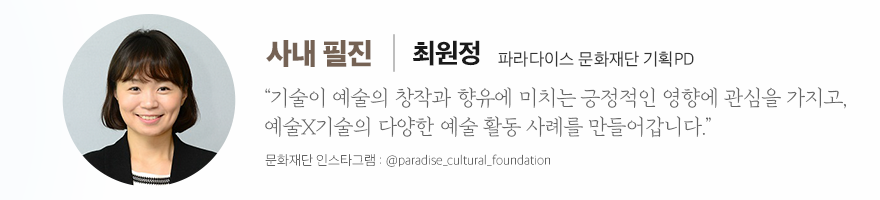 눈 앞에 쏟아지는 디지털 파도를 마주한 적 있으신가요? 거대한 건물이 빛과 색으로 물들어가는 광경을 마주치거나 자연을 모방한 기계의 움직임에 감탄한 적은요? 최근 예술에 관심을 기울인 분이라면 한 번쯤 만나보셨을 순간입니다. 이러한 순간에 만난 작품들은 우리에게 강렬하고 생경한 감각을 선물해줍니다. 폭발적으로 발전하는 기술에 힘입어 예술 또한 새롭게 변화하고 있는데요. 기술이 인공지능, 로봇, 우주 등 점점 영역을 넓혀감에 따라 예술의 영역도 함께 확장되며 사회가 새로운 영역들을 사유할 수 있는 기회를 부여해주고 있죠. 예술을 감상하고, 공유하는 방식 또한 기술의 발전에 따라 계속해서 새롭게 태어나고 있습니다. 더욱 색다르고 다양하게 진화를 거듭하고 있는 예술 작품들을 지금부터 함께 살펴볼까요?