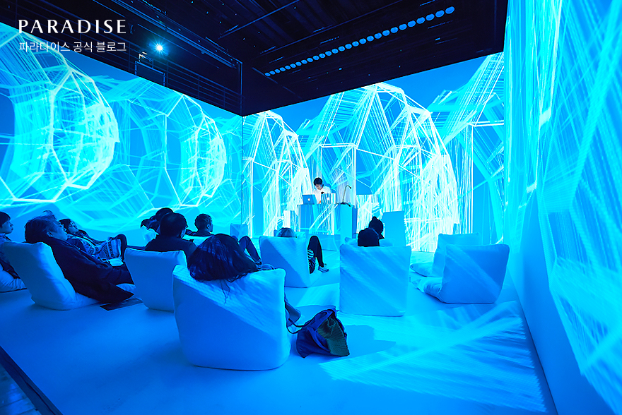 2023 파라다이스 아트랩에서는 빛과 소리를 촉각적으로 느낄 수 있는 공간도 준비되어 있습니다. 이러한 공간을 디자인하는 오디오 비주얼 아티스트 윤제호는 컴퓨터로 만든 소리와 광학 장치로 현실 공간에 디지털 공간을 만드는데요. 이를 통해 현실과 가상이 혼재된 시대를 살아가는 현대인에게 고민거리를 던집니다.
