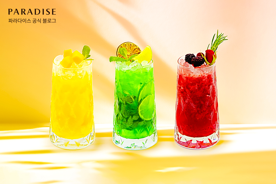 라운지 파라다이스에서는 ‘Pink Paradise’와 같은 시그니처 칵테일부터 다양한 종류의 하이볼, 논알콜 음료를 즐길 수 있는데요. 이번 여름에는 더위를 날려줄 청량한 탄산이 가득한 음료 3종을 새롭게 선보였습니다.