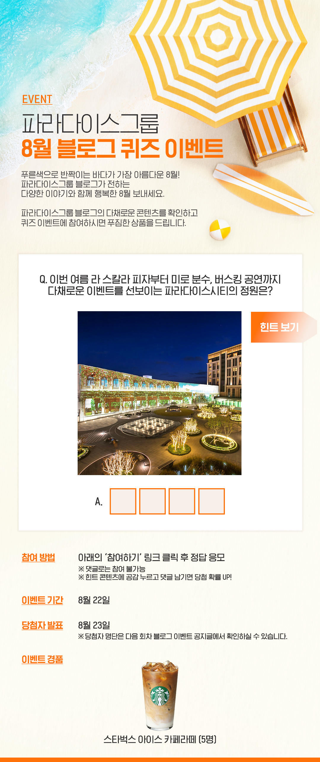 | 파라다이스그룹 8월 블로그 이벤트 (1회차) (46) | 2023.08.21 |