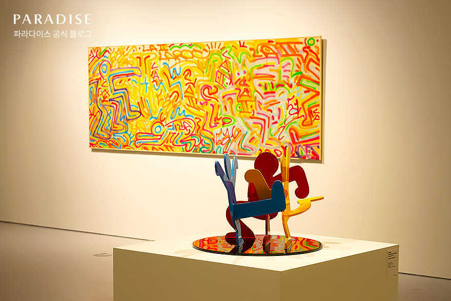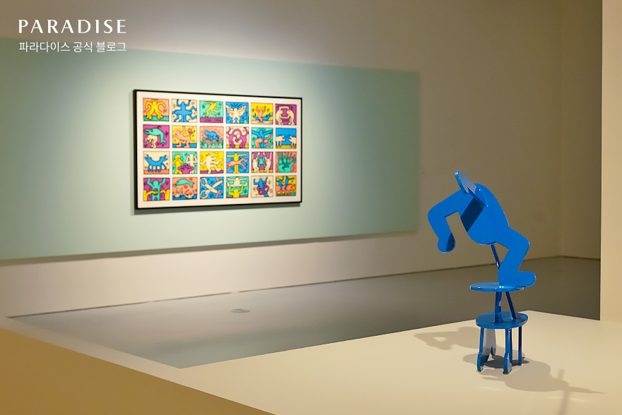 인천 전시 추천 ‘Love In Paradise: Banksy & Keith Haring’展을 본격적으로 관람하기 위해 파라다이스시티의 아트 스페이스로 향했는데요. 웅장한 신전에 와 있는 듯한 입구를 지나니 다채로운 색상이 돋보이는 키스 해링의 작품들이 유쾌하게 반겨주었습니다.