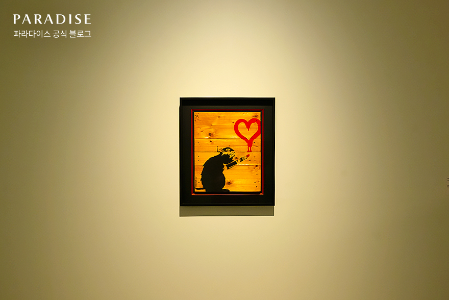 이어서 시선을 앞으로 돌리니 쥐와 하트가 그려진 작품이 눈에 들어왔습니다. 뱅크시가 자주 사용하는 상징 중 하나인 ‘쥐’가 활용된 <Love Rat on palette, 러브 랫 온 팔레트>는 사랑의 힘을 말하고 있는데요. 어쩌면 도시에서 가장 혐오 받는 존재일 수 있는 쥐가 작고 붉은 하트를 그려내는 모습을 통해 아이러니하지만 위안을 받은 작품이었습니다.