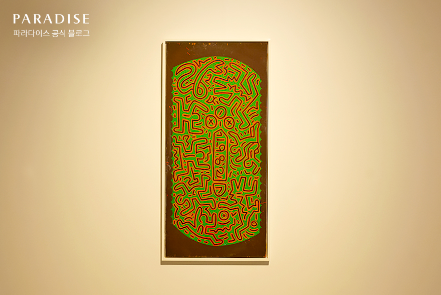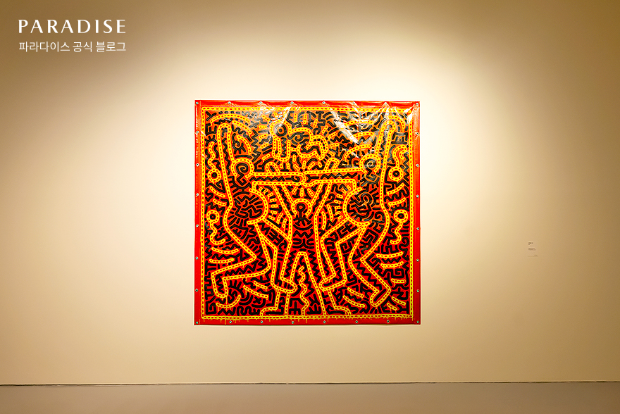 마지막으로 소개할 키스 해링의 작품은 밝고 생동감 넘치는 분위기가 인상적이었습니다. 작가 특유의 그래피티스러운 느낌이 돋보이는 이 작품은 임산부, 아이 등의 상징적 이미지를 활용해 생명을 탄생시키는 인간의 몸에 대한 찬사를 표현했는데요. 특히 독특한 재질의 공업용 비닐 방수포 위에 그림을 그려, 넘치는 생명력을 나타낸 점이 새로웠습니다.