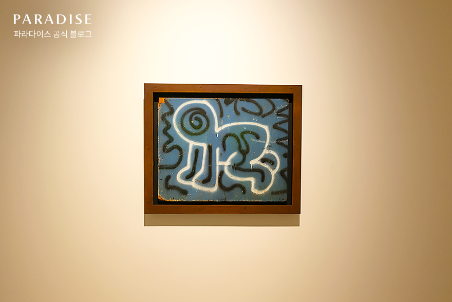 이어서 옆으로 시선을 돌리니 신비로운 느낌의 아이가 표현된 작품을 만날 수 있었습니다. 배경과 대비되는 흰색의 굵은 선으로 묘사된 아이는 장난스러우면서도 밝은 에너지를 뿜어냈는데요. 이는 키스 해링을 대표하는 아이콘 ‘빛을 내는 아기’ 이미지로, 미래의 성장과 변화의 잠재력을 표현했다고 합니다.