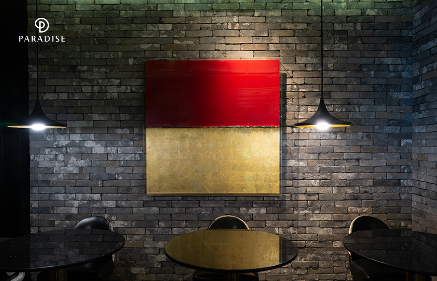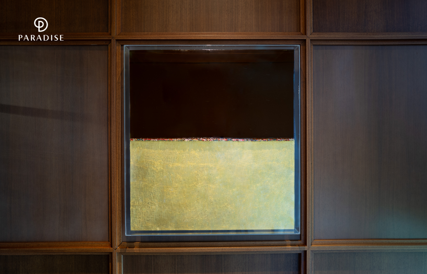 이 작품 역시 제목은 <Untitled>입니다. 표면이 거친 부분은 금으로, 광택이 나는 부분은 옻으로 칠했다고 합니다. 금 부분은 오랜 비바람을 견딘 듯한 자연적인 느낌을 준다면 옻 부분은 인간이 손수 쌓아 올려야만 하므로 사람의 정성과 손길을 느낄 수 있죠. 하나의 음식에서도 여러 맛을 내는 라 스칼라의 미식처럼 대비와 색채로 다양한 감정을 전달하는 허명욱 작가의 두 작품을 파라다이스 호텔 부산에서 만나보세요.