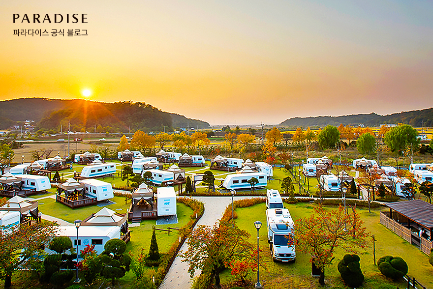 가을 노을 아래 스파를 함께 즐길 수 있는, 파라다이스 스파 도고 카라반 캠핑장