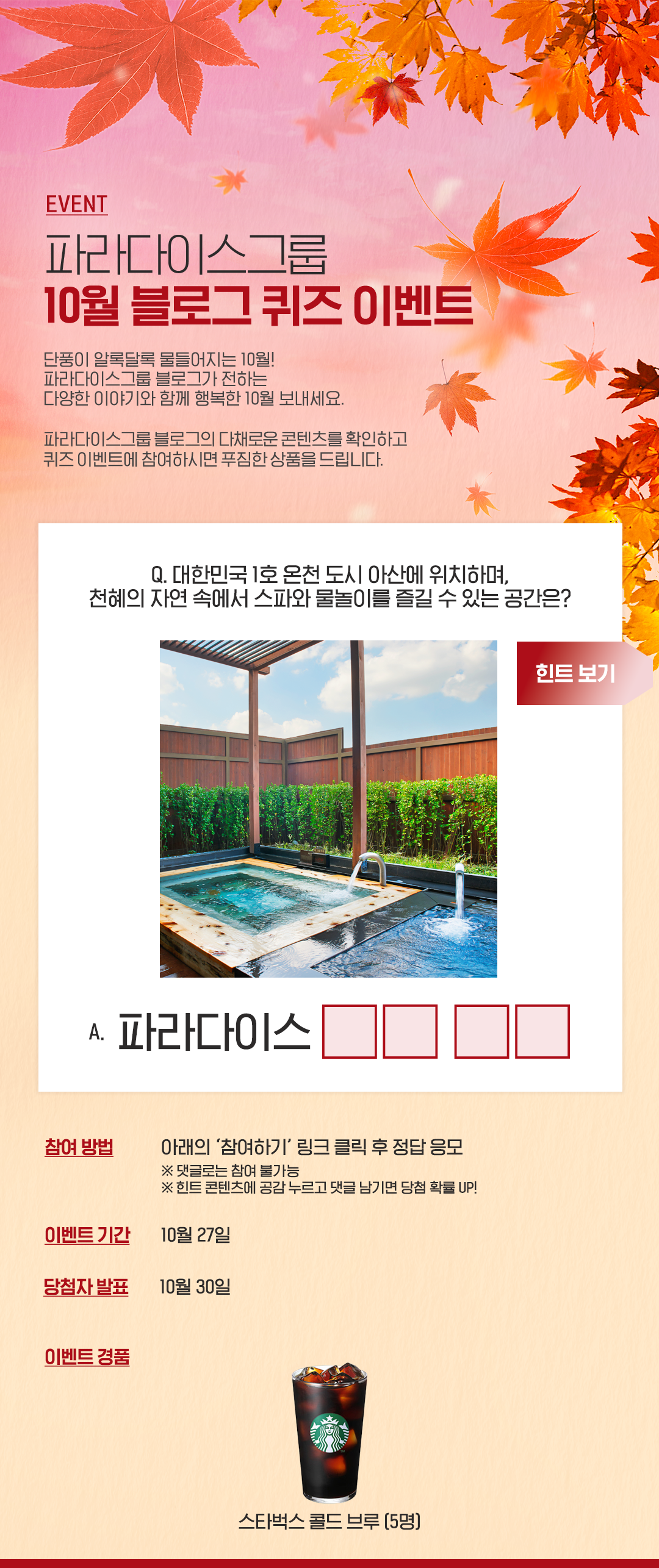 | 파라다이스그룹 10월 블로그 이벤트 (3회차) & 2회차 당첨자 발표 (29) | 2023.10.25 |