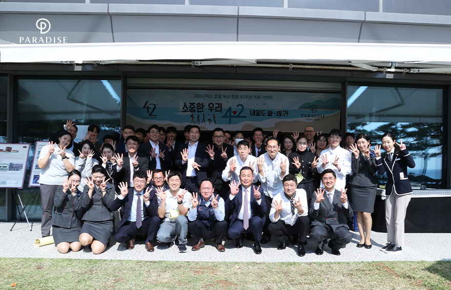 지난 11월 1일, 파라다이스 호텔 부산이 창립 42주년을 맞이했습니다. 파라다이스 호텔 부산은 일상을 보듬는 ‘치유’와 진정한 ‘휴식’을 함께 선사하는 ‘치휴 데스티네이션’으로 자리매김해 국내 최고의 호텔로 큰 사랑을 받아왔는데요. 지난 10월 마지막 주, 창립 이후 42년간의 헤리티지를 되돌아보고, 새로운 40년을 향한 힘찬 도약을 위해 파라다이스 호텔 부산의 창립기념일을 기념하는 뜻깊은 행사가 진행되었습니다! 부산을 대표하는 호텔이 되기까지의 여정을 되새기는 전시부터 신청곡과 함께 고생한 동료를 칭찬하는 웃음 가득한 음악 다방까지! 파라다이스 호텔 부산을 사랑하는 파라디안의 마음이 빛났던 행사 현장 속으로 함께 가볼까요?