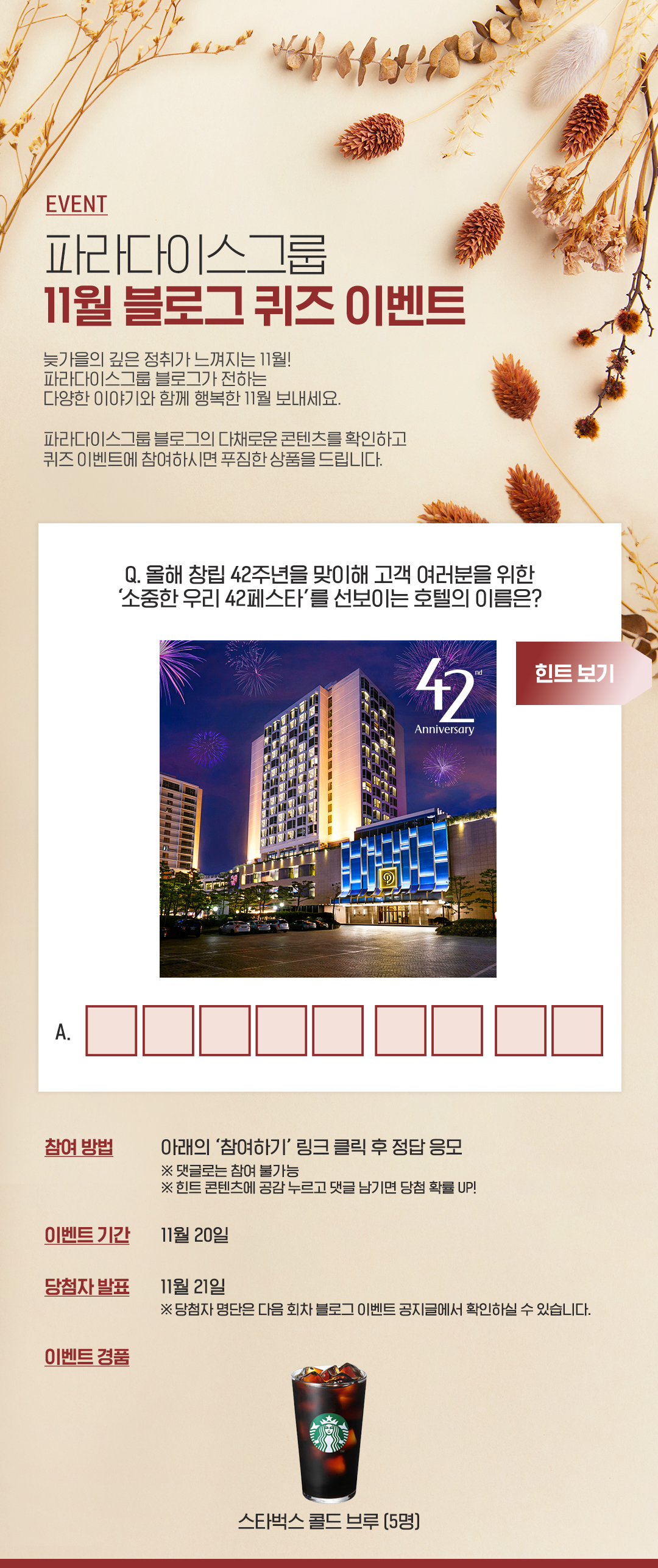 | [11월 사보 이벤트] 파라다이스 호텔 부산 42주년 기념, 가로세로 낱말 퀴즈 EVENT (1) | 2023.11.09 |