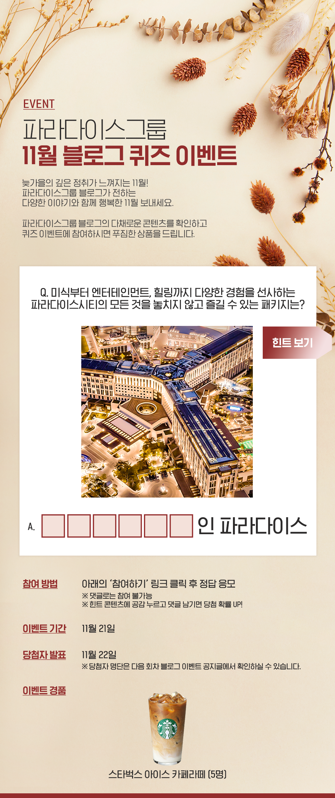 | 파라다이스그룹 11월 블로그 이벤트 (1회차) (33) | 2023.11.20 |