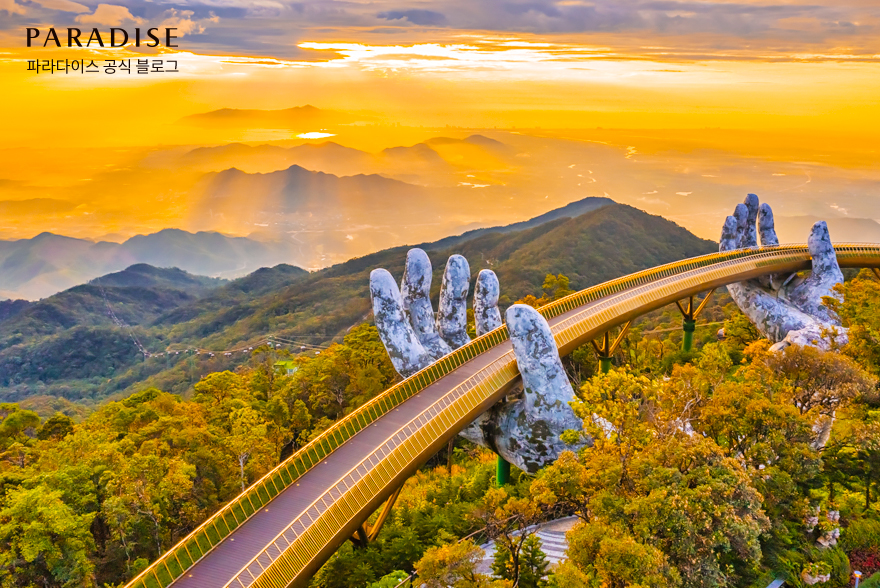다낭의 대표적인 명소 중 하나인 바나 힐은 인생 사진을 건질 수 있는 필수 코스인데요. 해발 1,487m 높이의 산 위에 위치한 테마파크로, 케이블카를 타고 올라가면 이색적인 공간이 펼쳐집니다. 베트남과 프랑스 문화를 동시에 느낄 수 있는 테마파크에서 시간을 보낸 후, 바나 힐의 대표 인증샷 명소인 골든 브릿지도 방문해 보세요. 거대한 두 손이 황금빛 다리를 떠받치고 있는 모습의 골든 브릿지는 어디에서도 보지 못한 풍경을 연출합니다. 다낭이 한눈에 내려다보이는 바나 힐에서 잊지 못할 경험과 함께 인생 사진까지 놓치지 마세요.