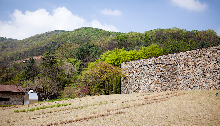 사물과 사물의 관계에 대한 통찰은 이우환 작가의 또 다른 작품 <관계항>에서도 표현되어 있습니다. 이 작품 또한 이우환 작가가 곤지암 와인 셀러에 방문한 뒤 영감을 받아 제작한 야외 설치 작품인데요. <조응>이 ‘그려진 것’과 ‘그려지지 않은 것’의 관계를 회화로 표현했다면, <관계항>은 ‘만들어진 것’과 ‘만들어지지 않은 것’의 관계를 설치 미술로 드러냅니다. 산업화의 산물인 ‘철판’과 세월의 흔적이 묻어 있는 ‘자연석’으로 만들어져 자연의 품에 오롯이 안겨 있는 곤지암 와인 셀러의 특별한 무드와 함께 어우러집니다.