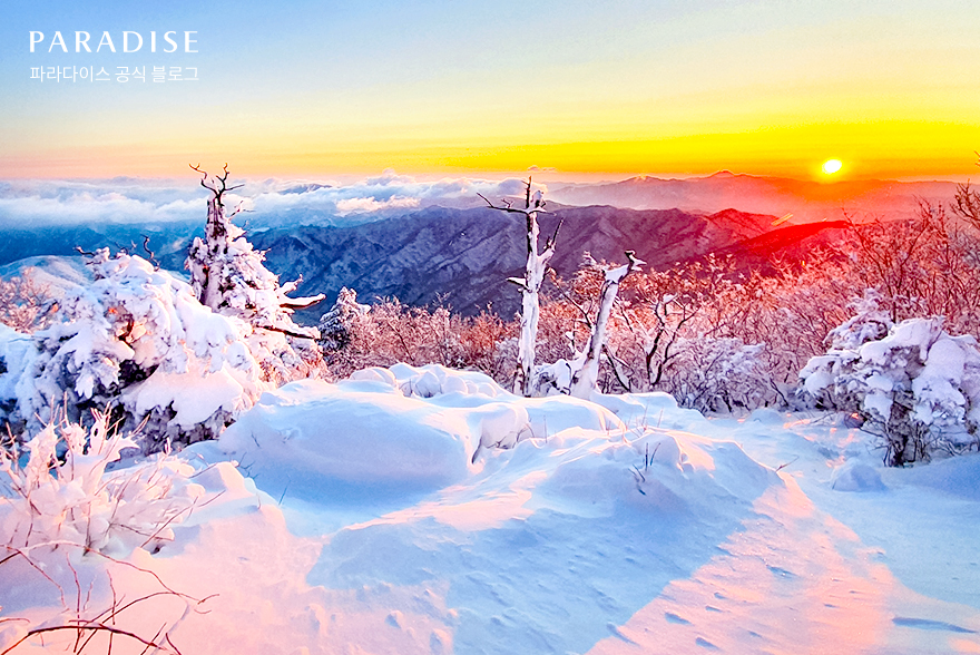 이어서 바다와는 또다른 매력을 느낄 수 있는 산으로 이동해볼까요? 다음으로 소개할 실패 없는 해돋이 명소 추천은 새하얀 설국으로 유명한 전라북도 무주의 덕유산입니다. 덕유산 일출 명소로 유명한 향적봉에 올라 눈앞에 펼쳐진 장관을 만끽해 보세요. 새하얀 눈으로 뒤덮인 산을 붉은 태양이 점차 주황빛으로 물들여가면서 놀라운 풍경을 연출합니다. 높은 산에 올라 2024년의 첫 일출을 감상하며 활기찬 새해의 기운을 얻어가는 것은 어떨까요?